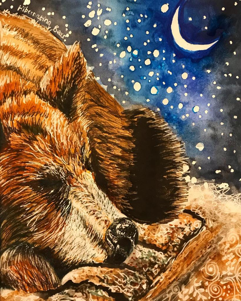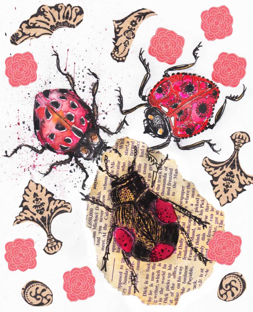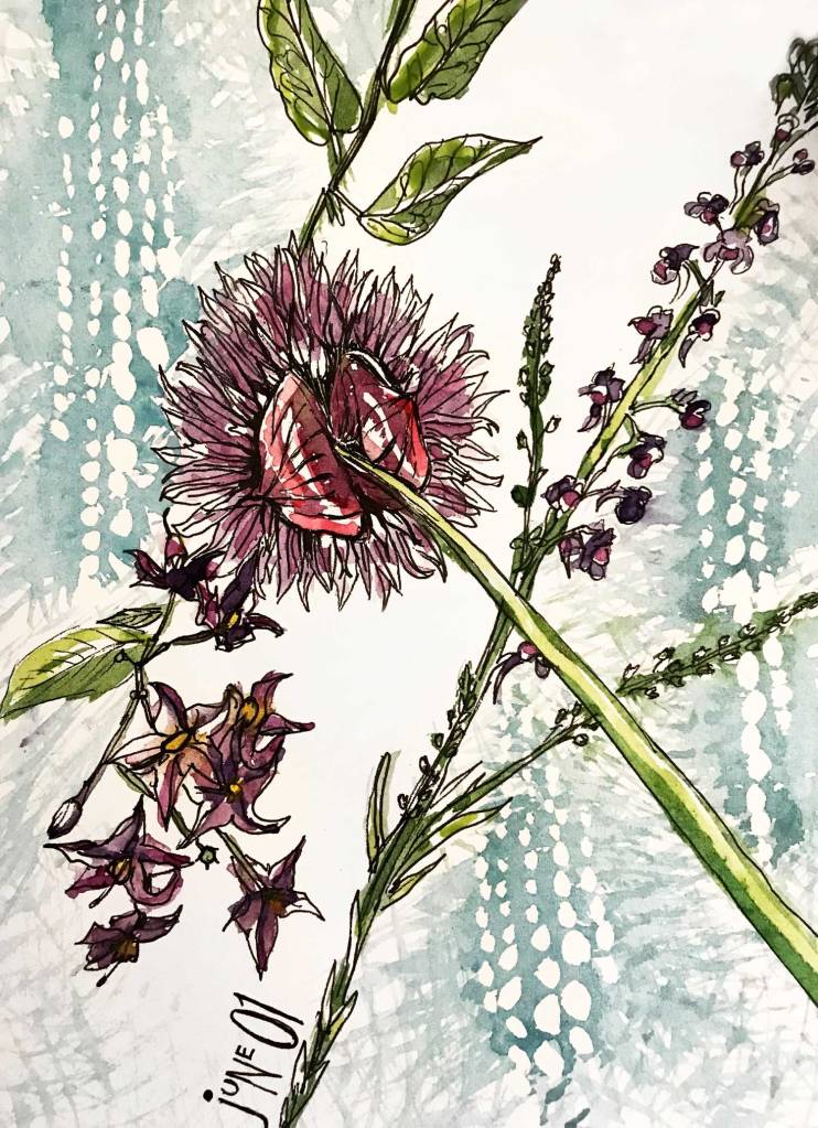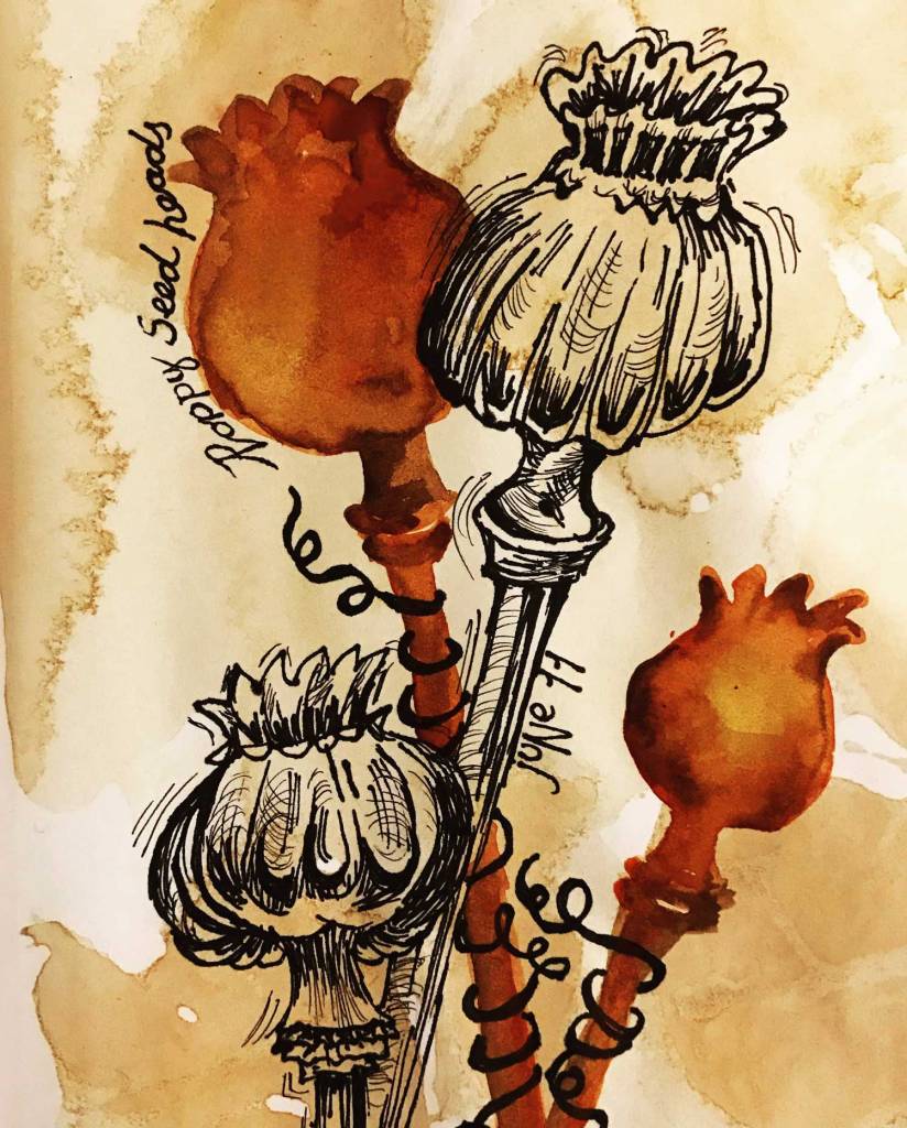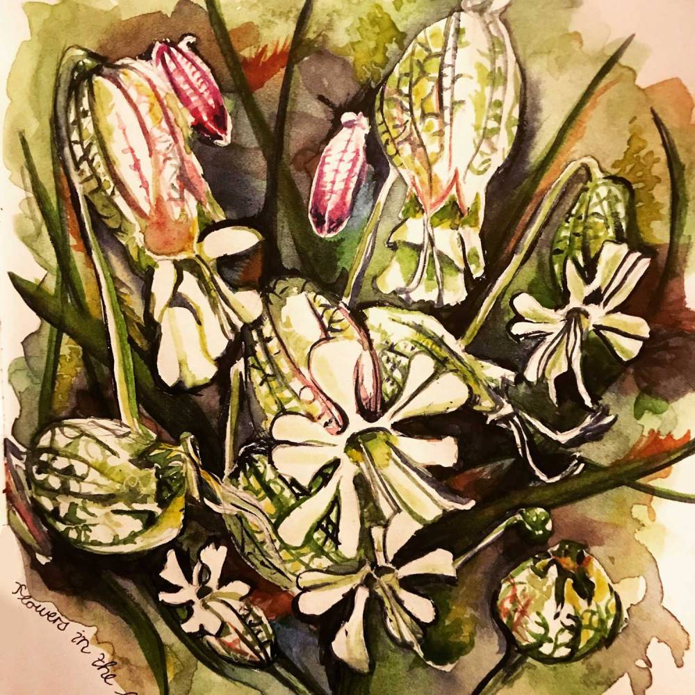 I am inspired by the natural world, I adore seed pods, their organic but exquisite forms are so intricate and beautiful. I also love to illustrate wild animals and hope that the wildlife conservation message starts to resonate with more people and that in a small way my art may influence people to really see, appreciate and love all animals and nature as much as I do. My style is illustrative and detailed, and has a strong narrative. It is whimsical and usually colourful. My subject matter is almost always organic. I create mostly in pen and ink with watercolour, but I enjoy using a variety of media, including acrylic paint and pens, gel pens, pencils, paper collage, printing etc.